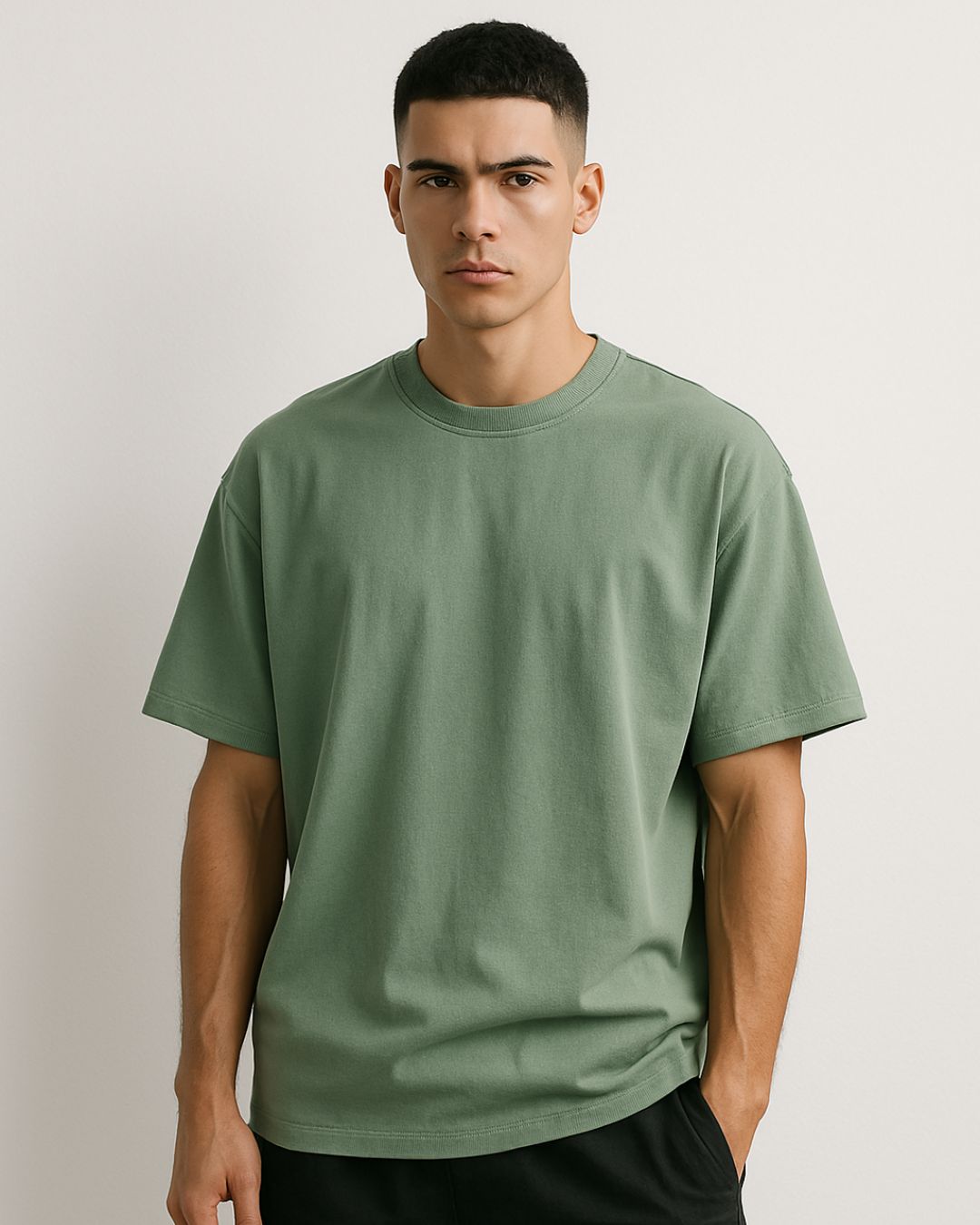 Made for guys who like their style clean and effortless. This plain oversized t-shirt in [Sage green] is crafted from premium cotton that feels soft yet structured. Slightly dropped shoulders and a relaxed fit give it that boxy, modern look — perfect for chilling, layering, or stepping out.